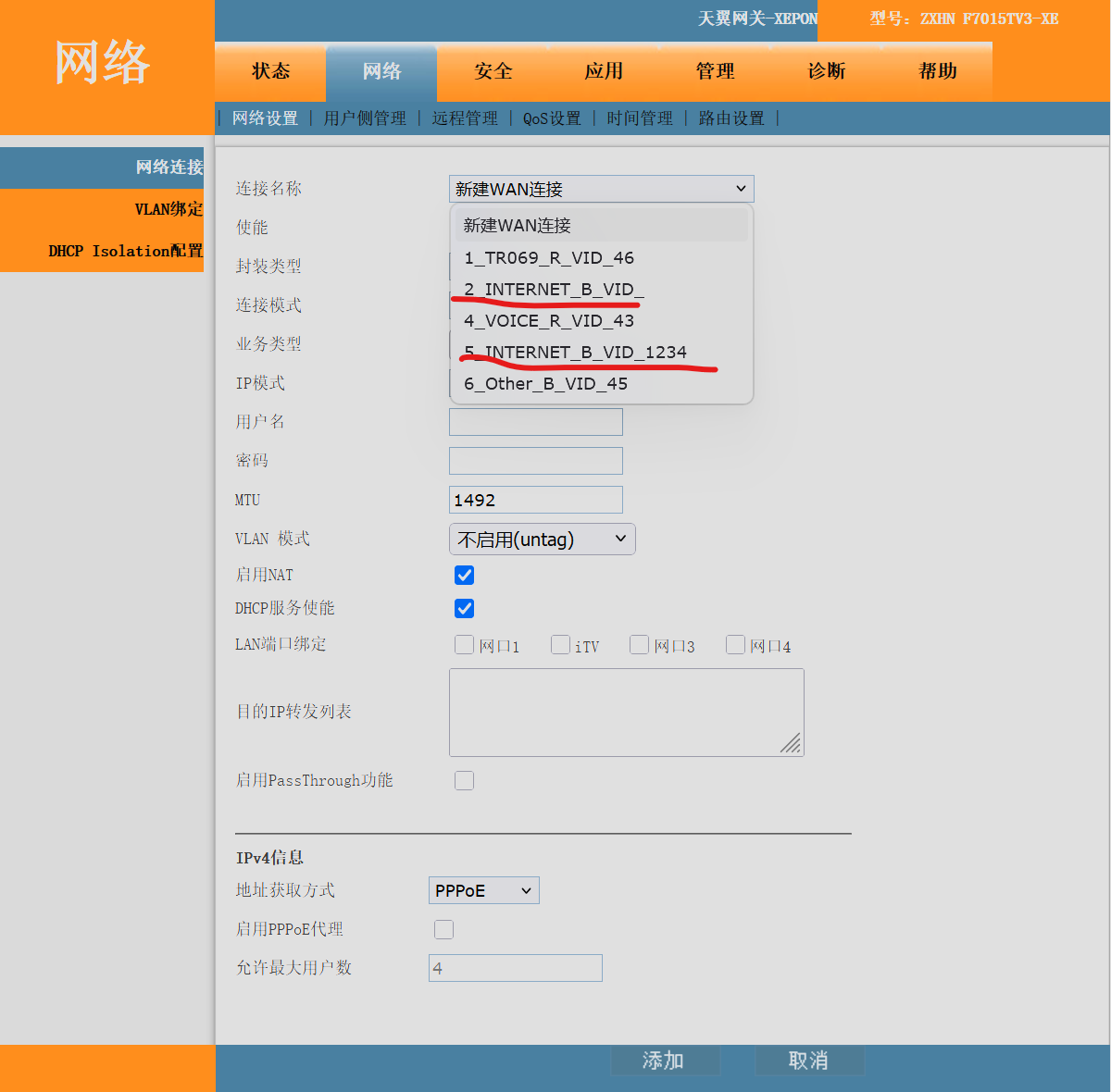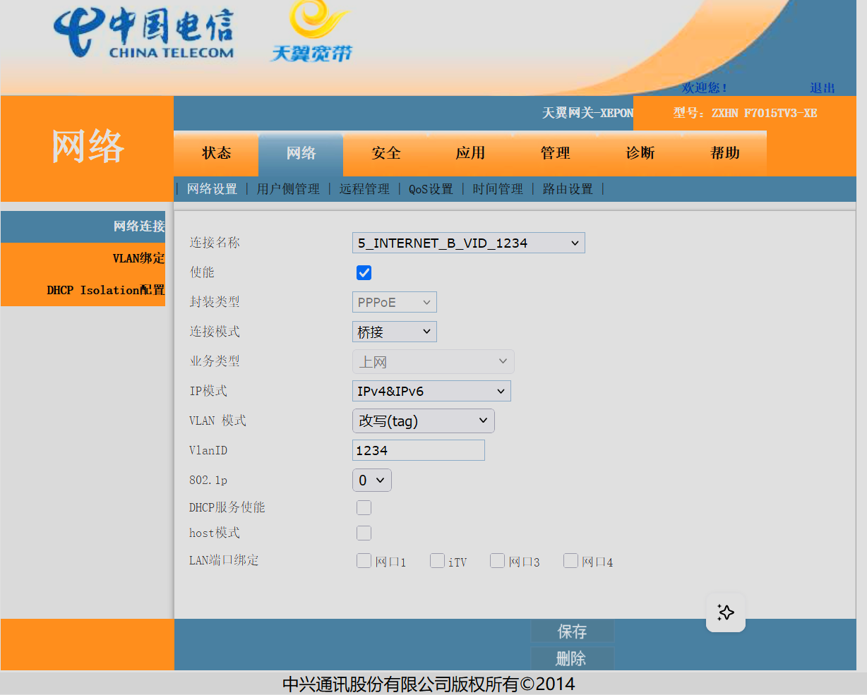 在光猫的管理员后台(不同的型号的光猫进入管理员后台的方法不同,有一些甚至进不去管理员后台,这里就不细讲了),把对应连接方式的lan口绑定全部取消,然后设置对应网口的vlanid和vlan绑定